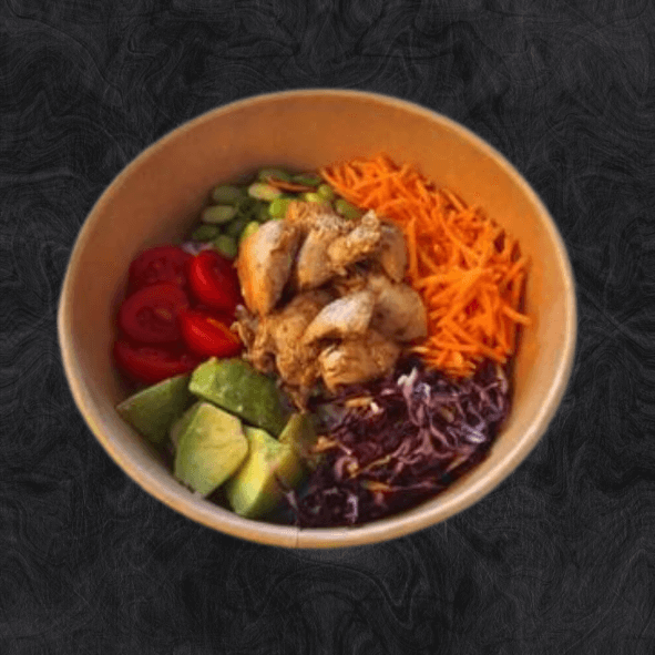 Riz basmati, avocat, tomates cerises, choux rouges, carottes râpées, edamane, poulet mariné teriyaki